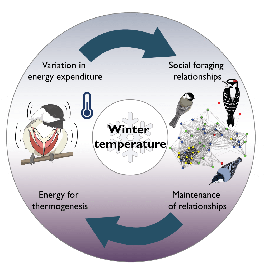 If you live in a temperate climate like much of North America, you may have at some point watched a small bird flittering around outside in the middle of the winter and asked, how are they surviving out there? Small winter-resident birds must maintain high temperature in extremely cold air temperatures and scarce resources. They must maintain a tight energy budget that ensures they do not freeze to death overnight, while also being able to avoid predators. This incredible biological feat right outside our windows have inspired me and my collaborator, Maria Stager at University of Massachusetts Amherst to study wintering birds. I had been approaching this question using tools of behavioral ecology: crafting ways to collect data on how animals behave in the wild. In this case, our lab had started to use RFID-enabled bird feeders to study the daily feeding patterns and social networks of wintering birds in Nebraska (e.g., black-capped chickadee, white-breasted nuthatch, downy woodpecker, etc.) to ask questions such as, how do social relationships influence individual’s behavioral responses to cold temperatures (Madsen, Vander Meiden, & Shizuka 2021)? We also studied how use of acoustic signals influenced food finding in mixed-species flocking birds (Hafeez et al., forthcoming). On the other hand, Dr. Stager had conducted seminal studies on metabolic flexibility and thermogenesis in small wintering birds like dark-eyed juncos (see Dr. Stager’s google scholar profile). In 2023, we received a collaborative grant to join forces to study the feedback between social behavior and thermal physiology using winter resident mixed-species flocking birds in Nebraska and Massachusetts. We are innovating how we study body temperature in birds in the wild while we also measure their foraging and flocking behavior, and we will be conducting experiments to test hypotheses about how overnight thermal demands drive intra- and interspecific social foraging, and how social foraging dynamics may influence the ability to regulate overnight body temperature.